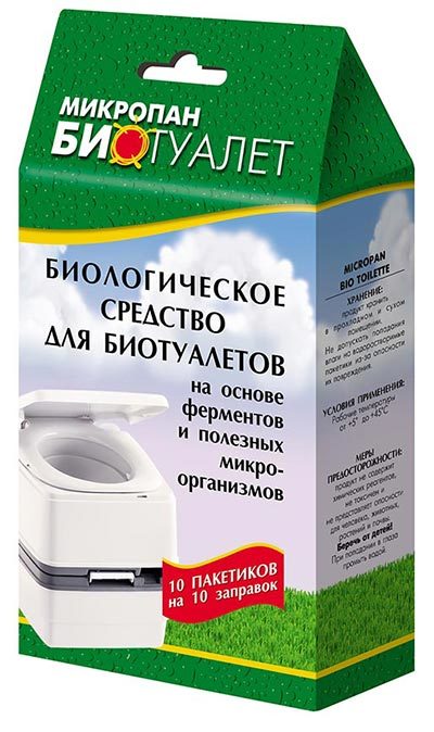 Картонная коробка содержит 10 водорастворимых пакетиков по 10 грамм. 1 упаковка рассчитана на 10 заправок стандартного 20-литрового биотуалета.