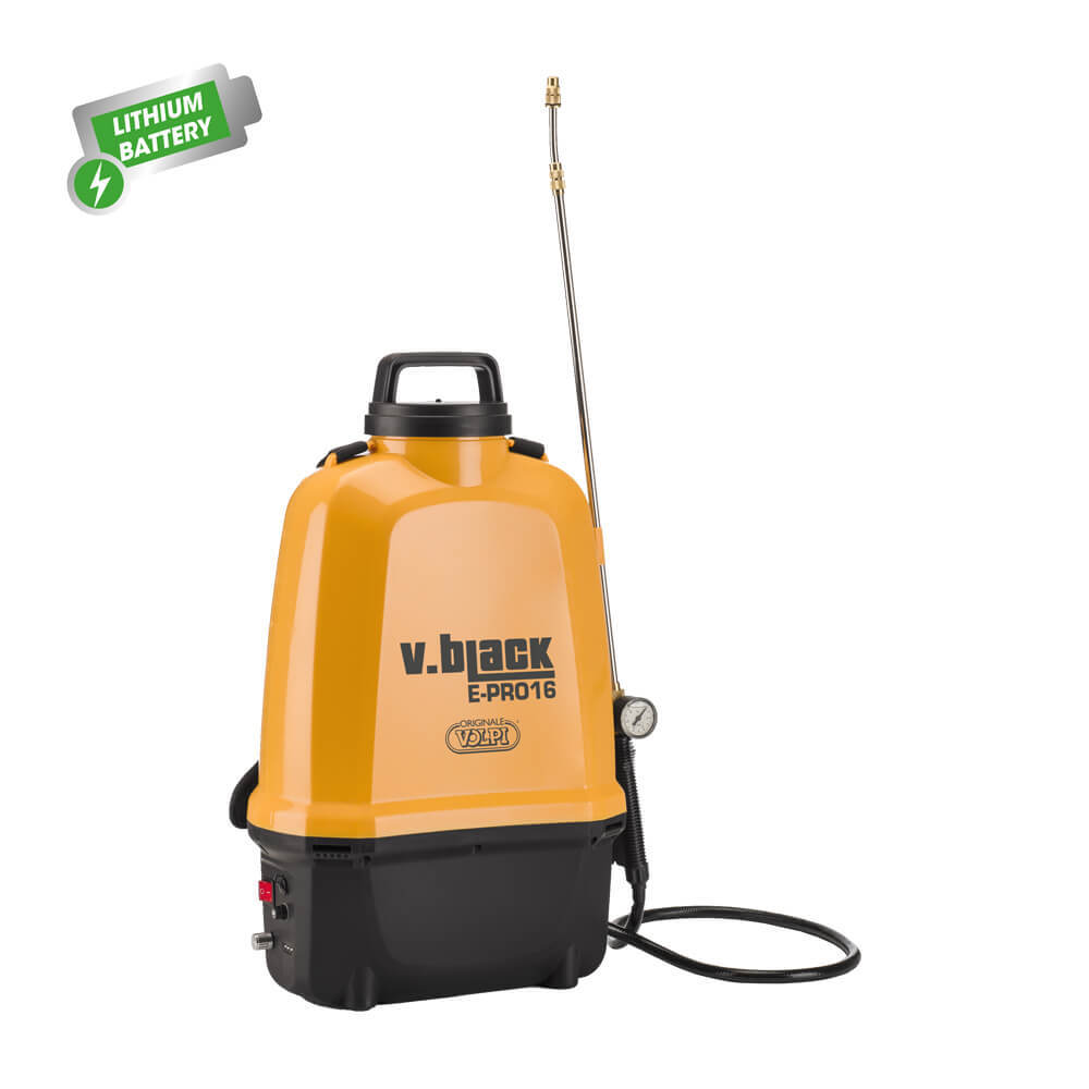 Аккумуляторный ранцевый опрыскиватель Volpi V_BLACK E-PRO 16 для профессионального использования и ежедневной эксплуатации. Поставляется с телескопической штангой и комплектом из 2-х форсунок. Благодаря полному отсутствию выхлопных газов может применяться для обработки растений в закрытых помещениях, таких как: теплицы, парники и оранжереи. Высокопроизводительный мембранный насос обеспечивает идеальное и однородное распыление даже на высоте до 6 м. Мощный литий-ионный аккумулятор 12 Вольт 8 Ач, размещенный для большей защиты внутри корпуса опрыскивателя, обеспечивает продолжительную работу распылителя в автономном режиме.