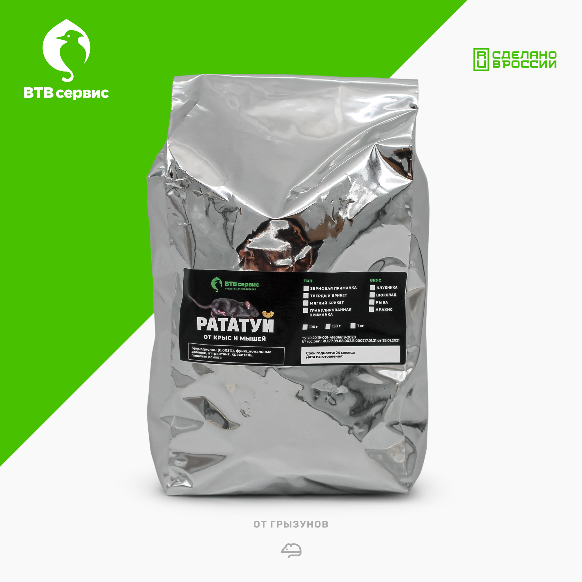 Родентицидное средство "Рататуй" предназначено для снижения численности серых, черных крыс, домовых мышей, полевок (обыкновенных, водяных, рыжих) и др. грызунов.