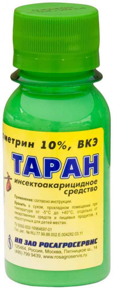 Инсектоакарицидное средство Таран представляет собой концентрат эмульсии на водной основе, в виде густой эмульсии молочного цвета. Предназначено для уничтожения иксодовых клещей – переносчиков возбудителей клещевого энцефалита, болезни Лайма и других заболеваний при обработке природных стаций в открытой природе персоналом организаций, имеющих право заниматься дезинфекционной деятельностью, а также для уничтожения тараканов, муравьев, клопов, блох, мух и комаров на объектах различных категорий: в жилых и нежилых помещениях, гостиницах, общежитиях, на предприятиях общественного питания, в детских и лечебных учреждениях (в выходные или санитарные дни) персоналом организаций, имеющих право заниматься дезинфекционной деятельностью, а также населением в быту. Для приготовления рабочих эмульсий требуется 0,5-5гр препарата на литр воды. Норма расхода препарата составляет 50-100 мл на квадратный метр в зависимости от вида насекомого и типа обрабатываемой поверхности. Продолжительность остаточного действия 4 – 8 недель.